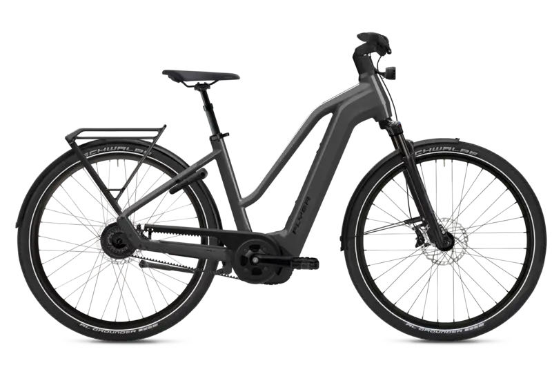 De Flyer Gotour 7.23 Mixed in Cold Anthracite Gloss biedt met een Bosch Performance Line CX Smart 85Nm middenmotor, traploze Enviolo versnelling, riemaandrijving en SR Suntour vering van 75mm een comfortabele en krachtige e-bike ervaring voor elke dag.