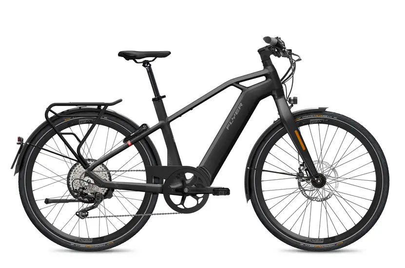 De FLYER Upstreet6 7.10 HS Gents in stijlvolle Black Gloss met 48cm frame biedt met zijn krachtige TDCM motor in het achterwiel, Shimano 10-speed derailleurversnellingen en comfortabele voorvorkvering een prettige en betrouwbare rijervaring voor elke stedelijke rit.