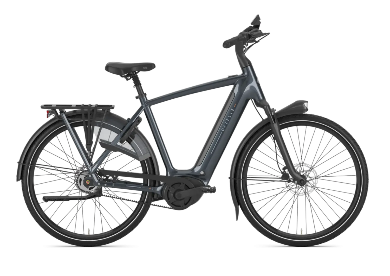De Gazelle Grenoble C5 HMB Heren in glanzend antracietgrijs combineert krachtige ondersteuning met de stille Bosch Performance Line middenmotor en een onderhoudsvriendelijke belt-aandrijving, ideaal voor comfortabele en betrouwbare stadsritten.